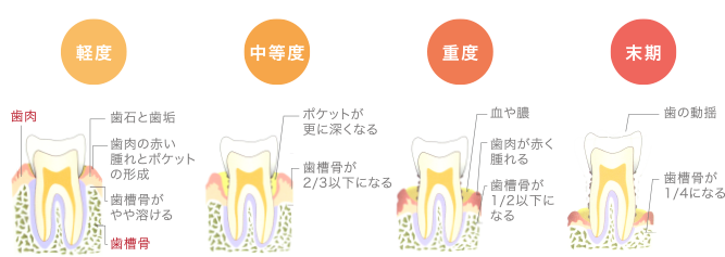 • 歯根膜の破壊と歯槽骨の溶解で、歯と歯肉の間がはがれてできるポケットから血やうみ(膿)が出る。