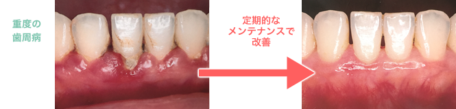 • 歯槽骨の溶解とポケットの深化が進み、歯がぐらつく。全体に歯肉が下がるので、歯が伸びてみえる。
