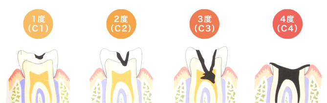 虫歯は歯の表面についた歯垢(プラーク)に細菌(ミュータンス菌やラクトバチラス菌)が棲みつき糖分を栄養に酸を出して歯の表面の硬いエナメル質を溶かします。これが虫歯の始まりで、痛くないからと放っておいても虫歯は自然には治りません。治療を受け、それ以上進行しないように歯を守っていくことが大事です。
